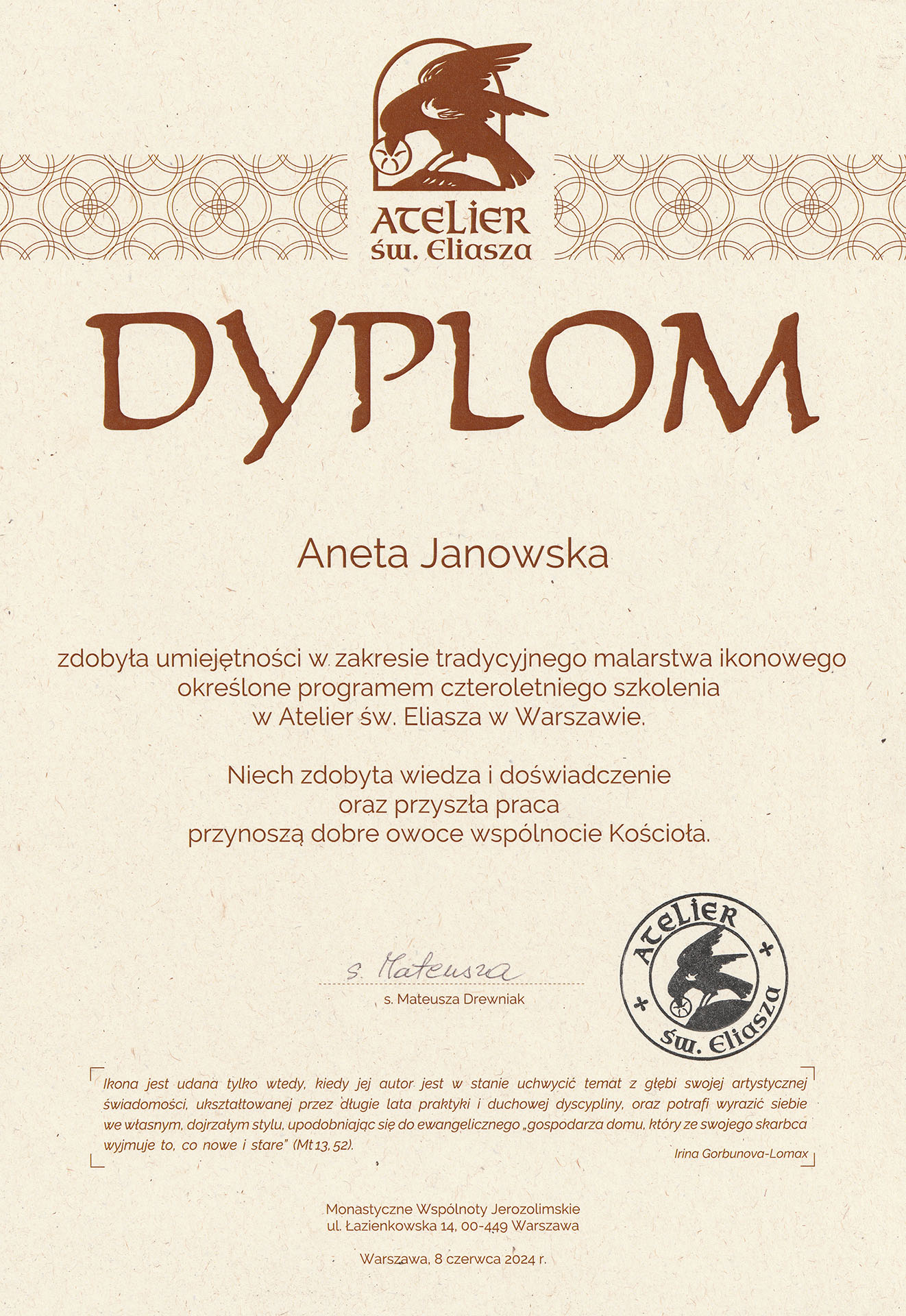 W 2024r. ukończyłam 4-letnie studium w zakresie malarstwa ikonowego w Atelier św. Eliasza w Warszawie. Szkoła prowadzi nauczanie malowania ikon według reguł tradycyjnej ikonografii, inspirując się metodą pracy realizowaną przez Irinę Gorbunovą-Lomax. Obok kształcenia praktycznego, zdobyłam wiedzę z zakresu historii ikonografii, sztuki wczesnochrześcijańskiej, bizantyńskiej i staroruskiej.