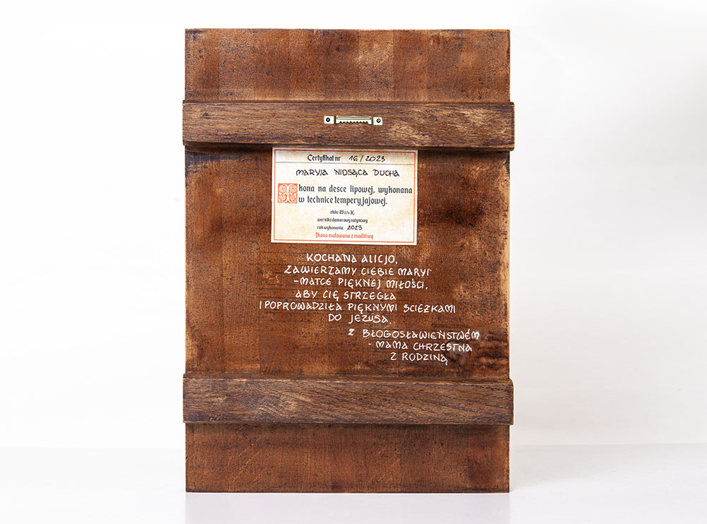 Również na prośbę osoby zamawiającej na odwrocie ikony umieszczona zostanie odręczna dedykacja imienna.
